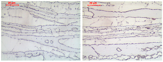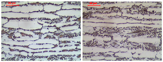 Microstructure of the analysed stainless steels observed in the as-delivered state, including: X2CrNiMoN22-5-3 steel—left; X2CrMnNiN21-5-1 steel—right. Light microscope pictures, magnified 200 times.