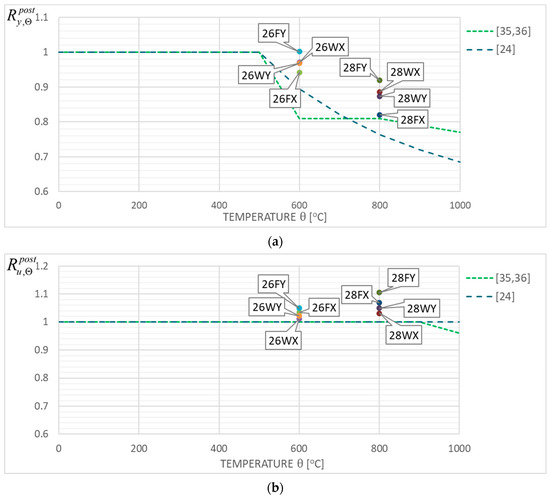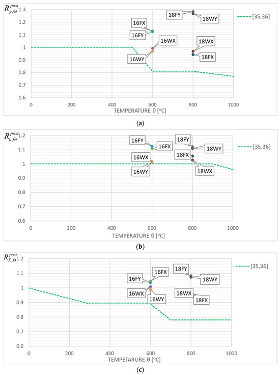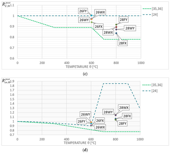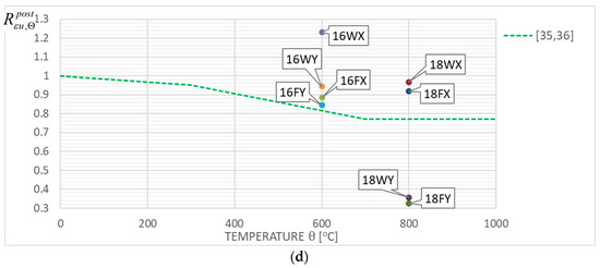The results of the research reported here seem, to a large extent, to positively conform to the recommendations contained in [35,36], as they are located in general on the safe side when compared with the bottom limit values contained therein. This remark pertains not only to the post-fire strength of tested steel, but also to its post-fire ductility. The significantly reduced capacity for plastic strain exhibited by a sample previously heated for a sufficiently long time at a temperature of 800 °C, regardless of the cooling mode applied (as shown for the samples denoted as 18FY and 18WY in Figure 13d, and, independently, in Figure 7), seems to be a notable exception here. Such behavior, due to the inherent risk of brittle failure, unequivocally excludes the capacity for the extended use of this steel grade and in particular for safe load-bearing service after a fire. It is clearly visible that in many fire development scenarios which may occur in real life, the tested steel does not fully recover its strength after surviving a fire incident followed by effective cooling. However, in many other scenarios, the mechanical properties of this steel visibly improve, and this may justify the absence of recommendations to apply an appropriate reduction in limit tensile strength value and an assumption of , as depicted in Figure 13b and Figure 14b. In this context, the recommendation contained in [35,36] pertaining to the reduction in the value of the linear elasticity coefficient (Figure 13c and Figure 14c) seems to be very safe as well.