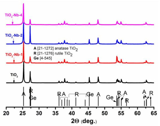 X-ray diffraction patterns of TiO2-Nb materials. Adapted from [17] with permission from John Wiley and Sons.