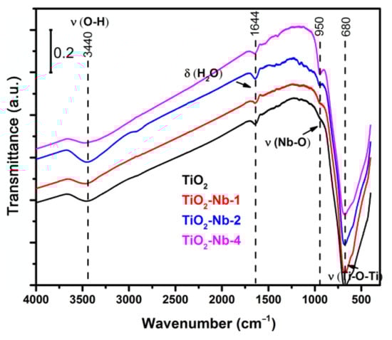 FTIR spectra of a series of TiO2-Nb (0, 1, 2, 4 mol%) materials are shown in Figure 2. All spectra demonstrate a broad absorption band centered at 3440 cm−1, which is related to symmetric and asymmetric stretching vibrations of families of bridging hydroxyls associated via hydrogen bonds [36,37,38,39]. The presence of absorption bands at 1644 and 1540 cm−1 can be attributed to deformation vibrations of water molecules on the adsorption centers of the surfaces of materials such as coordinatively unsaturated titanium and niobium ions, as well as oxygen vacancies [36,37,38,39]. All spectra are dominated by a broad band at 680 cm−1, characteristic of TiO2, which is attributed to symmetric stretching vibrations of the Ti–O–Ti bridges in slightly distorted TiO6 octahedra linked by common vertices [40]. The intensity of the weak band at 950 cm−1 increases with increasing niobium content in doped materials, and its presence can be attributed to the symmetric stretching mode of O=Nb surface groups, which are present in the most strongly distorted octahedral structures [41].