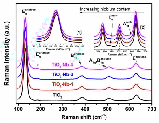 Raman spectra were recorded to confirm the phase composition and to reveal in more detail the effect of doping (Figure 3). All spectra contain the following Raman modes: Eg (132, 188, 631 cm−1), corresponding to symmetric stretching vibrations O–Ti–O; B1g (~388 cm−1); as well as A1g + B1g (~508 cm−1), characteristic of the anatase phase [42]. Mode B1g corresponds to symmetric bending vibrations O–Ti–O, and mode A1g corresponds to antisymmetric bending vibrations O–Ti–O [43]. The presence of an intense mode at 132 cm−1 (the characteristic mode of anatase vibrations) indicates that TiO2 nanocrystals have a certain degree of long-range order, being well-crystallized [44,45]. The modes of the rutile phase Eg and A1g (~506 and 615 cm−1, respectively) are weakly expressed due to its small fraction [46]. A red shift of the modes of the anatase phase is observed in connection with an increase in the unit cell parameters due to doping with Nb, which monotonically increases with an increase in the content of niobium in the materials (inserts 1 and 2 of Figure 3). The results of calculating the full width at half-heights of the maximum of the most intense anatase mode Eg confirm this conclusion: a monotonic increase is observed (17.10 cm−1 for TiO2, 17.97 cm−1 for TiO2-Nb-1, 18.21 cm−1 for TiO2-Nb-2 and 19.70 cm−1 for TiO2-Nb-4, ±0.05 cm−1). The redshift of the Eg modes during doping is a consequence of an increase in the concentration of point defects—charged oxygen vacancies [47].