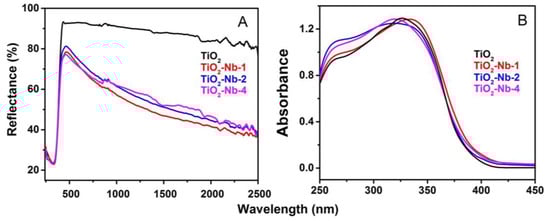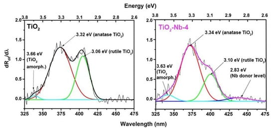 It was found that doping does not affect the band gaps of the phases. The values of two optical transitions with energies of approximately 3.10 eV and 3.33 eV obtained regardless of the analysis method used can be attributed to the band gap of TiO2 phases, which refers to the indirect transitions allowed from the edge of the Brillouin zone to its center, namely X1α/X1b → Γ1b and Γ3 → X1b, respectively, of the rutile and anatase phases of TiO2 [49,50]. The weakly expressed extra peak in the region of 3.6 eV the authors of the [51] associate with the presence of a minor amount of amorphous phase. In addition to the fundamental value of the edge of the absorption band, an extra peak can be detected in the visible light reflection for the Nb-doped TiO2 samples. We attribute this to the appearance of a niobium cation at Ti-site [52]. Khomenko et al. [53] also observed weak absorption bands between 2.3 eV and 2.9 eV, and they assigned them to d–d transitions associated with Ti3+ localized states.