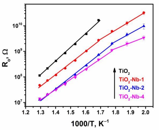 Despite the abovementioned formation of a significant number of acceptor defects during doping, the resistance of materials decreases upon Nb introduction. The temperature dependence of the resistance of pure TiO2 is linearized in lgR vs. 1/T coordinates, which indicates the activation character of the conductivity. The value of the activation energy of the conductivity, determined in the range of 300–500 °C, is 0.9 ± 0.03 eV, which is somewhat higher than the value determined in [54], which was 0.65 eV for an undoped thin film. The difference is due to a different phase ratio and synthesis method (Table 1). For TiO2-Nb samples, two linear parts can be distinguished in the high-temperature (280–500 °C) and low-temperature (200–280 °C) ranges (Figure 6). An increase in the niobium content leads to a decrease in the activation energy of conductivity in both temperature ranges (Table 3).