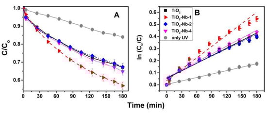 (A) Kinetic curves of methylene blue photobleaching in the presence of pure TiO2 and Nb−doped TiO2 photocatalysts, (B) same curves plotted in logarithmic coordinates.