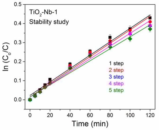 For a stability study (Figure 9), the catalyst precipitate was separated from the solution via centrifugation at the end of each cycle, washed with buffer solution and used in subsequent cycles. The results demonstrate that Nb(V)-doped TiO2 does not lose its photocatalytic activity after five successive cycles of methylene blue photobleaching. A slight decrease in photocatalytic activity may be due to loss of catalyst during washing and the adhesion of dye molecules on the surface of the photocatalyst. To improve the stability of Nb(V)-doped TiO2 photocatalytic activity, it is recommended that the catalyst should be washed with alcohol or acetone rather than with water or it should be annealed in a furnace.