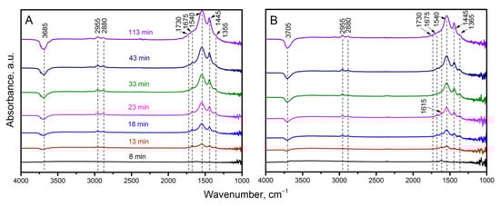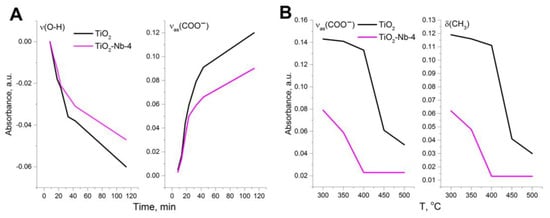 In situ DRIFT spectra for pure and modified TiO2-Nb-4 taken during signal accumulation ((A)—23 min and (B)—43 min since the beginning of the experiment).
