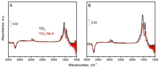 It seems possible to conduct a comparative analysis of the intensities of the IR profile bands of the TiO2 and TiO2-Nb-4 materials since the experimental conditions were identical. Selected comparative absorption spectra for the two materials are shown in Figure 11.