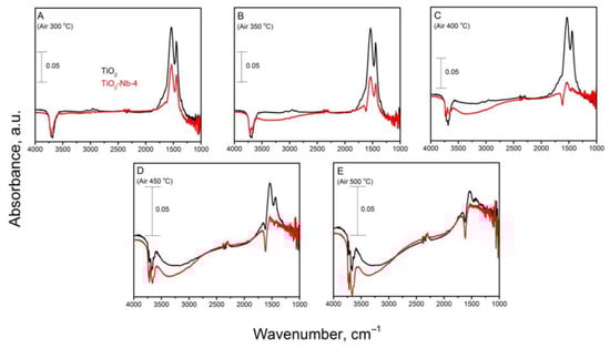 In situ DRIFT spectra of TiO2 and TiO2-Nb-4 taken during the passage of clean air at RH = 0% and T = 300–500 °C (A–E).