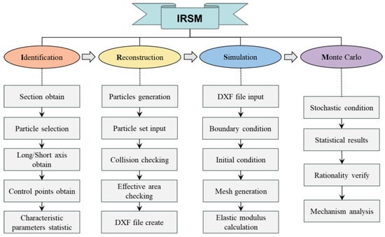 As shown in Figure 1, the method mainly includes four processes, namely, Identification, Reconstruction, Simulation, and Monte Carlo calculation. For identification, the purpose is to extract the geometric features of coarse aggregates in concrete [31], such as particle size, long-axis size, roughness, etc. For the reconstruction process, the purpose is to reverse reconstruct the geometric characteristics of coarse aggregate in concrete based on the identified characteristic parameters and rationally put it into the set area. For the evaluation process, the purpose is to calculate the elastic modulus of concrete by numerical simulation based on the generated concrete elastic modulus calculation model, combined with the initial conditions of the model, attribute parameters, and boundary conditions. For the Monte Carlo method [32,33], the purpose is to fully consider the nonuniformity of the coarse aggregate placement position and geometric characteristics in concrete so as to obtain the predicted elastic modulus of concrete with statistical significance.