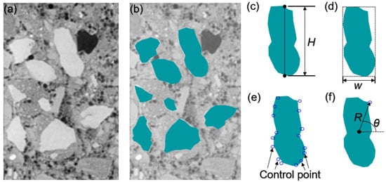According to Hohanson’s studies [34,35], it can be found that particle shape has great influence on the material mechanical properties and failure modulus. Therefore, in order to better reveal the influence of coarse aggregate on the elastic modulus of concrete, it is necessary to quantify the geometric features of coarse aggregate. Therefore, an efficient feature recognition method for concrete coarse aggregate is proposed, which can accurately identify the geometric size and angular characteristics of particles. The specific recognition process includes cross-section photography, coarse aggregate acquisition, long-axis acquisition, short-axis acquisition, feature point acquisition, and polar axis acquisition.