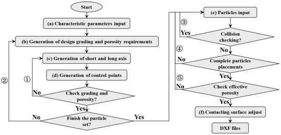 Based on Huang’s studies [30], a reconstruction method for the concrete to match the identified method proposed in this manuscript is put forward, and the corresponding construction process is shown in Figure 4. Firstly, the geometric parameters of coarse aggregate are input into the calculation model. Then, according to the grading and porosity requirements of coarse aggregate, the coarse aggregate content Ac in each grading range is calculated. Then, according to the grading requirements, the short-axis length W of coarse aggregate is generated, and the corresponding long-axis H of coarse aggregate is constructed according to the long-axis ratio β. Then, according to the number of control point parameters N, feature angle θ and relative length α are identified to reconstruct the corresponding coarse aggregate geometric contour. The constructed coarse aggregate is added to the coarse aggregate generation set, and whether the allowable error of the area value of a single gradation is satisfied is judged, as shown in the process ①. If it is not satisfied, the particle is re-generated; otherwise, it enters the next cycle. According to the gradation order from large to small, coarse aggregate generation sets within the corresponding gradation range are constructed successively, as shown in process ②, until all the generation sets are completed.