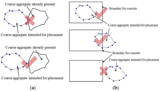 When the coarse aggregate generation set is constructed, the particles need to be put into the corresponding concrete space. The coarse aggregate is placed in the order from large to small so that a higher efficiency can be obtained [30]. When a new particle is placed, all the feature points of the new particle are tested against the particles that have already been placed. The new coarse aggregate will only be placed if all the feature points of the newly placed coarse aggregate are outside the already placed coarse aggregate as shown in Figure 5a (this is also known as the collision detection process). If some of the new coarse aggregate is inside the concrete space as shown in Figure 5b, this is repeated until all the pellets have been placed. Since part of the coarse aggregate may be outside the concrete space, which may cause the porosity of the concrete accumulation model to be different from the design porosity, it is necessary to conduct a secondary test to ensure that the generated porosity is within the allowable range of the design porosity error. For the consideration of the contact surface between coarse aggregate and cementing material, the coarse aggregate outline is mainly shifted inward, and the offset distance is equal to the thickness of the contact surface. Then all the coarse aggregate is put in and converted to a numerical output format that the software can recognize (DXF files are recommended).