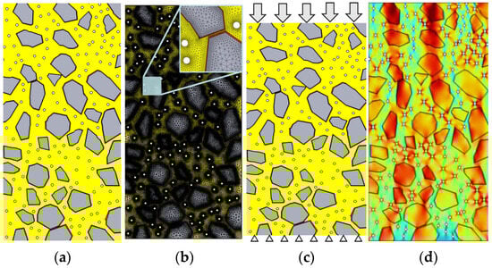 In order to predict the elastic modulus of concrete, based on the generated concrete geometric model containing contact surface, COMSOL software [37] was used to establish the corresponding numerical simulation model. The modeling and analysis process is shown in Figure 6. Figure 6a shows the geometric model in the numerical analysis, which mainly includes four parts, namely coarse aggregate, contact surface, bubble, and cementing material, all of which a have different elastic modulus. Figure 6b shows the results of the grid division of the calculated region. It should be noted that a smaller grid size, while allowing for more accurate prediction results, will increase the amount of computation. Therefore, the model adopts a “transitional” grid division method [38], that is, small-size grids are used for some small-size areas (such as contact areas and other areas of concern), while large-size grids are used for some large-size areas (such as coarse aggregate center and other cementing material areas), and a grid coefficient less than two times is used to amplify the two different sizes of the grids. The problem of nonconvergence that may exist in the calculation of the model is eliminated. Figure 6c shows the boundary conditions of the elastic modulus of concrete. In this model, fixed boundary conditions are set at the bottom of the concrete, boundary conditions of force F are set at the top, and free boundary conditions are set on both sides of the model. Figure 6d shows the stress distribution results of the model after compression. It can be seen from the Figure 6d that large stress distributions appear around the aggregate edges and bubbles, which is related to the stress concentration [11] caused by the elastic modulus of the material and geometric effects.