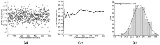 In order to fully consider the nonuniform characteristics of the geometric shape and distribution characteristics of the concrete coarse aggregate, the Monte Carlo method was used for analysis. A set of typical analysis results are shown in Figure 7a. In Monte Carlo analysis, it is very important to determine a reasonable random number of times, which requires a balance between statistically significant results and model computations. Hence, the cumulative average of the calculation results under different calculation times was statistically analyzed, as shown in Figure 7b, and it can be found that the model is basically in a state of equilibrium when the calculation amount reaches 500 times, so 500 times is set as the standard calculation times of the model. The statistical results calculated by the model are shown in Figure 7c. It can be found that the calculated results of the concrete elastic modulus show a trend of normal distribution across the horizontal line, and the average value is 25.8 GPa.