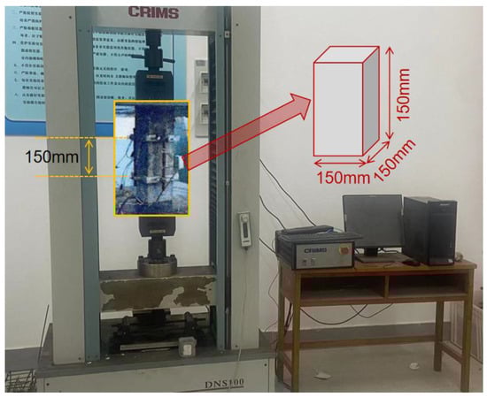 In order to test and obtain the elastic model of concrete, prismatic samples with a length, width, and height of 150 mm, 150 mm, and 300 mm, consisting of C40 and C35 level concrete, were prepared (shown in Figure 8) based on the Standard for Testing Mechanical Properties of Ordinary Concrete (GB_T50081-2019) [39], and the deformation and load values of concrete samples were obtained by micro-deformation measuring the instrument and pressure module. It should be noted that the distance between the two marks is 150 mm, as shown in Figure 8.
