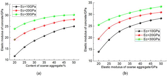 Figure 9 shows the simulation results at the different contents and elastic modulus of coarse aggregate. It can be seen from Figure 9a that with the increase in the coarse aggregate content, the elastic modulus of concrete presents a nonlinear increase, and the increasing trend gradually slows down. In the analysis of the reasons, with the increase in the coarse aggregate content, concrete gradually formed a mechanical skeleton composed of coarse aggregate, improved the deformation resistance of concrete, and thus showed a higher elastic modulus. When the coarse aggregate content reaches 40%, the mechanical skeleton inside the concrete has been perfected. Therefore, with the continuous increase in the mixed coarse aggregate content, the contribution of the increased coarse aggregate content to the mechanical skeleton gradually weakens, and the increase rate gradually slows down. Comparing the test results of different cementing materials, it can be found that the lower the elastic modulus of cementing materials, the greater the influence of the increase in the coarse aggregate content on the elastic modulus of concrete.