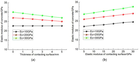 Figure 10 shows the simulation results at a different thickness and elastic modulus of contact surface between coarse aggregate and cementing material. As shown in Figure 10a, when the elastic modulus of the contact layer is the same as that of the cementing material (10 Gpa), the elastic modulus of concrete does not increase with the increase in the thickness of the contact layer. When the elastic modulus of the contact layer is less than the strength of the cementing material, the elastic modulus of the concrete gradually decreases with the increase in the thickness of the contact layer, and the greater the difference between the elastic modulus of the contact layer and the cementing material, the more obvious the reduction amplitude. Analyzing the reasons for this, the lower elastic modulus of the contact layer weakens the force transfer effect of the “force chain” of the coarse aggregate, and the greater the thickness of the contact layer, the larger the proportion of the contact layer in the “force chain”, the more obvious the weakening effect on the deformation resistance of the concrete, so the elastic modulus of the concrete increases with the increase in the thickness of the contact surface.