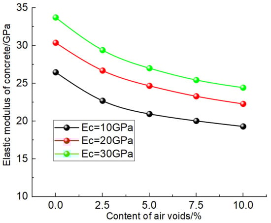 Figure 11 shows the evolution law of the concrete elastic modulus under different bubble contents. It can be seen from the Figure 11 that with the increase in the bubble content, the elastic modulus of concrete gradually decreases and presents a nonlinear trend. Analyzing the reasons for this, with the increase in the content of bubbles inside the concrete, the “force chain” will be affected by different degrees, such as disconnection, zigzag, etc., which will weaken the antideformation ability of the concrete, so the elastic modulus gradually decreases. When the bubble content is less than 5%, the effect on the “force chain” is significant, so the decrease amplitude of the elastic modulus of concrete is large. When the bubble content is greater than 5%, the “force chain” has been greatly disturbed, and the increase in bubbles has little impact on the “force chain”, so the decline gradually slows down. By comparing the test results of cementified materials under different elastic moduli, it can be found that the higher the elastic moduli of cementified materials, the greater the reduction caused by bubbles, which is related to the greater difference between the elastic moduli of bubbles and cementified materials. The greater the difference between the two, the more obvious the weakening effect of bubbles, and the greater the reduction in the elastic moduli of concrete.