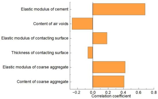 - According to Pearson’s analysis, the influences of each influencing factor on the elastic modulus of concrete are as follows: elastic modulus of cement, elastic modulus of coarse aggregate, content of coarse aggregate, content of air voids, elastic modulus of contacting surface, and thickness of contacting surface, and the corresponding correlation coefficients are 0.688, 0.427, 0.412, −0.269, 0.188, and −0.061, respectively.