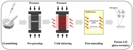 LD glass powders (0.4 g) were mixed with 0.1 g of 5–20 M NaOH solutions prepared using NaOH flakes (FUJIFILM Wako Pure Chemical Corporation, Osaka, Japan). The mixture was placed into a mold with diameter of 15 mm and pressed under a uniaxial pressure of 350 MPa. Simultaneously, the mold was heated to 200 °C with a heating rate of 10 °C/min and held for 30 min. Then, the pressure was released gradually along with natural cooling. Pellets, taken out from the mold, were washed with absolute ethanol and kept in the oven at 60 °C for 24 h. The post-annealing process was undertaken in a muffle furnace (EPDS-7.2K, ISUZU SEISAKUSHO Co., Ltd., Niigata, Japan). Under a heating rate of 5 °C/min, cold-sintered pellets were post-annealed at 800 °C for 30 min. The prepared pellets were notated as shown in Table 1, and detailed schematic diagrams of the overall experimental procedure for preparing porous LD glass–ceramics are presented in Figure 1.