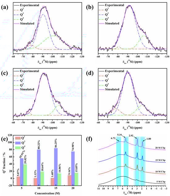 (a–d) Deconvoluted 29Si MAS NMR spectra of 5–20 M CSp; (e) the calculated Qn fractions; and (f) 1H MAS NMR spectra of silicate structures for 5–20 M CSp.