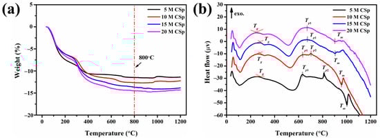 Thermal behaviors were subsequently detected for the 5–20 M CSp, as shown in Figure 3. The weight losses in the 5–20 M CSp increased from 11.4% to 14.6%, along with the NaOH concentration becoming higher (Figure 3a). As mentioned above, enhanced condensation reactions between residual Si–OH groups and the resulting increased H2O vapor were responsible for increasing weight losses [48,49]. Nevertheless, their thermal stabilization temperatures were almost the same, determined to be approximately 800 °C. Meanwhile, various characteristic peaks were also found in DTA curves of 5–20 M CSp, as shown in Figure 3b. The characteristic temperatures are listed in Table 3.