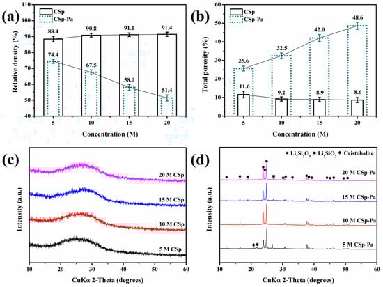 (a) Relative densities, (b) total porosities, and (c,d) XRD patterns of 5–20 M CSp/CSp-Pa.