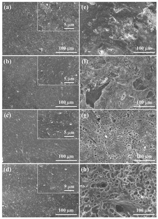 Fracture surfaces of (a–d) 5–20 M CSp and (e–h) 5–20 M CSp-Pa.