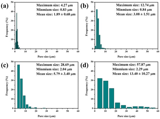 Size distributions of spherical pores formed for porous LD glass–ceramics: (a) 5 M CSp-Pa; (b) 10 M CSp-Pa; (c) 15 M CSp-Pa; (d) 20 M CSp-Pa.