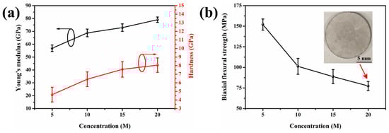 To be specific, with the increasing NaOH concentration, Young’s modulus and hardness varied from 56.9 ± 2.5 GPa to 79.1 ± 2.1 GPa and from 4.6 ± 0.9 GPa to 8.1 ± 0.8 GPa, respectively. It is shown in Figure 8b that the biaxial flexural strength of porous LD glass–ceramics exhibited a sharp decline from 152.0 ± 6.8 to 101.3 ± 9.7 MPa when the concentration of the NaOH solution rose from 5 M to 10 M. This reduction in biaxial flexural strength was attributed to the increasing number and size of spherical pores [36,56]. However, the biaxial flexural strength mildly decreased to 77.4 ± 5.4 MPa when the concentration of the NaOH solution further increased to 20 M. This phenomenon could be ascribed to the presence of more robust pore walls for the 15–20 M CSp-Pa in comparison with the 5–10 M CSp-Pa.