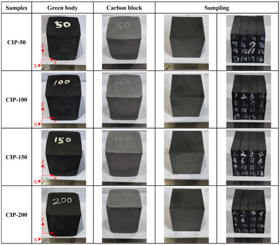 The samples were named CIP-50, CIP-100, CIP-150, and CIP-200 with respect to CIP pressure. Figure 2 shows images of the isotropic carbon blocks fabricated under different CIP pressures, and the overall experimental procedure is shown in Figure 3.
