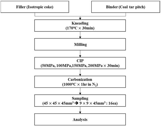 In this study, commercial isostatic coke (POSCO MC MATERIALS, Jeonnam, Republic of Korea) was used as the filler material, with an average particle size of 6.73 µm. The binder was a commercial coal tar pitch (Rain Carbon Inc, Stamford, CT, USA). Coal-based pitch has a softening point of 110 °C, quinoline insoluble ranging from 4 to 8%, toluene insoluble ranging from 22 to 28%, ash 0.3%, and a coking value of 54%. The filling material and binder were mixed at a weight ratio of 75:25, and the mixture was then kneaded at 170 °C for 30 min. Subsequently, the kneaded mixture was pulverized. A total of 255 g of the obtained powder was fed into urethane molds and then subjected to CIP for 30 min with pressures of 50, 100, 150, and 200 MPa. Three isotropic carbon blocks were prepared for each CIP pressure condition, and it was found that the deviation of density after surface treatment was small. Among them, a carbon block with a medium value was selected to check the uniformity within it.