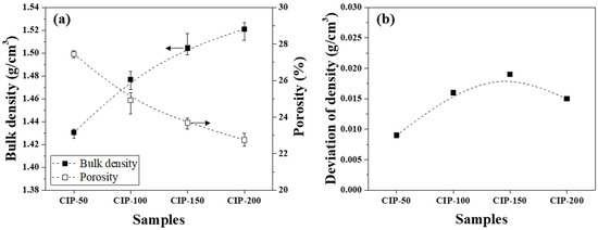 Figure 5a presents changes in the bulk density and porosity of the isotropic carbon blocks with respect to CIP pressure. CIP-50 exhibited a bulk density of 1.431 g/cm3 and a porosity of 27.4%. With an increase in CIP pressure, the bulk density increased while the porosity decreased. Indeed, the bulk density and porosity of CIP-200 were 1.521 g/cm3 and 22.7%, respectively.