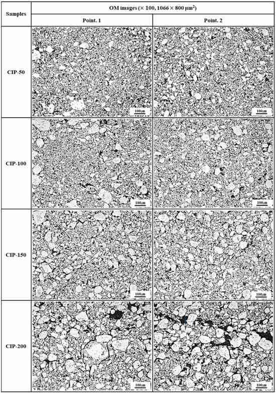Images of isotropic carbon blocks with respect to CIP pressure (100× by OM).
