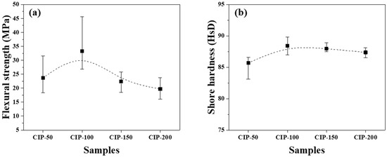 CIP-100 exhibited the highest flexural strength at 33.3 MPa, along with the highest Shore hardness at 88.2 HsD. As the CIP pressure increased further, both the flexural strength and hardness decreased.