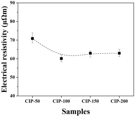 The lowest electrical resistivity was achieved in CIP-100 at 60.1 μΩm, and with a further increase in CIP pressure, the electrical resistivity also tended to increase.