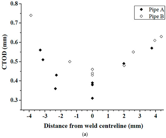 Figure 3a. For both pipes, the specimen with a notch located in the weld centerline showed the lowest CTOD value. The lowest CTOD value obtained in the weld of pipe A was 0.31 mm, which was about 28% lower than that of pipe B (0.43 mm). Vickers microhardness profiles across the weld measured at the middle of specimens, as indicated in