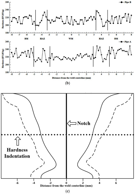 Figure 3b. A similar general trend of variation in hardness was observed for both pipes. The coarse-grained heat-affected zone (CGHAZ) exhibited the highest hardness, while the fine-grained heat-affected zone (FGHAZ) exhibited the lowest hardness. The weld fusion zone and the base metal had an intermediate hardness. The average hardness of base metal for pipe B (215 HV) was about 6.5% lower than that of pipe A (230 HV).