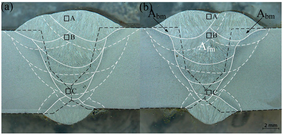Abm was the area between the fusion lines and the black dash lines, as marked by the black arrows, and the deposited filler metal