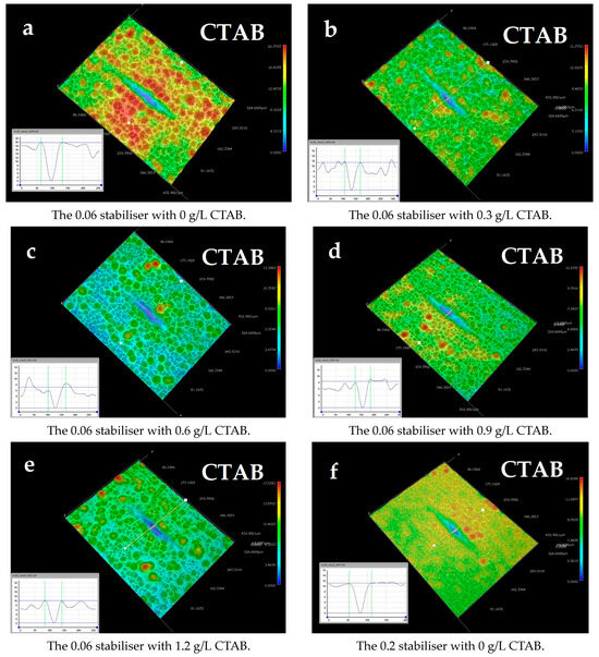 In the case of electroless coatings, substrate surface roughness is a key factor that influences the evolution of the final roughness of the coatings. This can be a crucial factor to consider while trying to mitigate surface roughness in AM parts, as AM-built parts tend to have a surface roughness in the order of 5–40 µm depending on the type of AM process [28,29]. Due to an increase in stabiliser concentration, as reported in [24], the average surface roughness (Ra) value was brought down to <1 µm (with the exception of the 1.2 g/L CTAB sample), as shown in Figure 5. However, no positive levelling was observed for this set of samples.