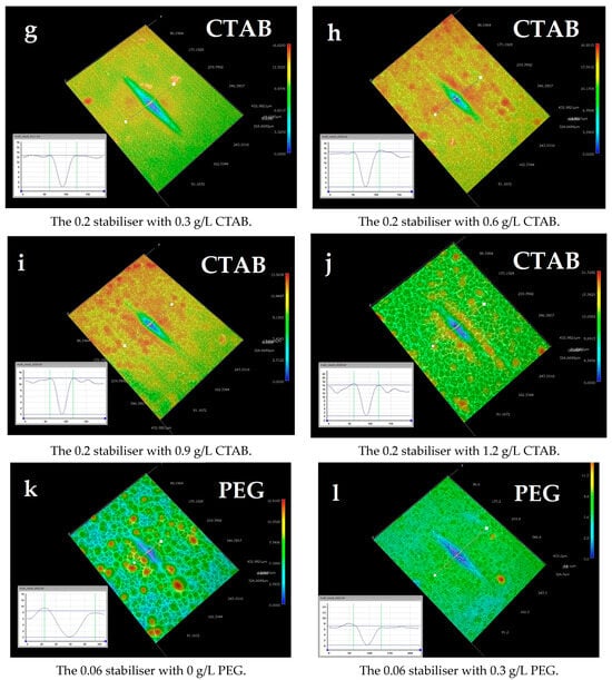 Further study on the influence of lower surface roughness on levelling was conducted. Based on a roughness attenuation study for Ni-B [24], a higher concentration of SnCl2 was used to study its impact on levelling. From Figure 1f–j, it is clear that the increase in stabiliser concentration modified the surface; however, the CTAB-aided roughness attenuation did not positively affect levelling, as shown by the levelling percentages of both Knoop and Vickers defects in Figure 2 and Figure 3, respectively.