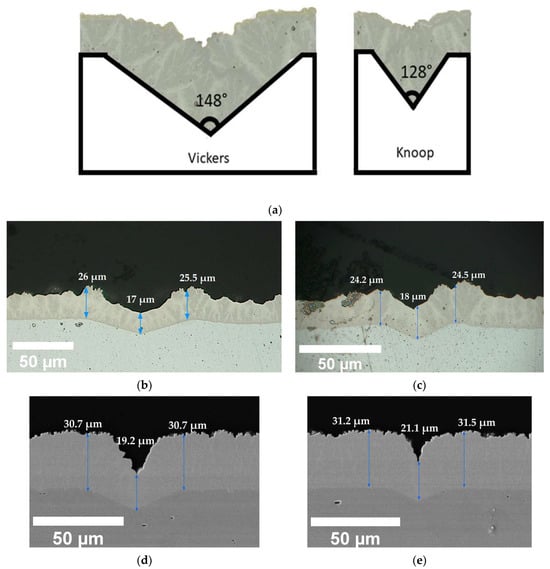 Conventional electroless deposition would produce a uniform coating over the substrate surface, especially over complex shapes. However, the optical micrographs as well as the cross section of defects revealed that the evolution of coating thickness over the defect depths and the defect edges (top of the defects) differs. Figure 6a–c, illustrate the expected and real cross-sectional coating morphology over both Vickers and Knoop defects for a 0.06 g/L addition of stabiliser. For a uniform load, the morphology of the defect surface produced varies according to the indent profiles. In addition to depth data detailed in Section 3.1, the width of Knoop to Vickers varies from 75 µm to 135 µm. Similarly, the angle of the defect walls varies from 128° to 148°, respectively. As shown in Figure 6a, due to the unique cauliflower-tree-like morphology of the NiB coating with a tin stabiliser [24], the coating over the defects was expected to evolve and fill the defects with a uniform-thickness coating, and the Knoop indent defects were expected to have a better fill. However, the real cross-section of the indent defects, as shown in Figure 6b,c, illustrates that the evolution of the coating thickness over the bottom of the defects and the top edges varies significantly. In the bottom of the defect, a smoother morphology with a thinner coating is observed, whilst the coating at the top edges of the defect shows more agglomerated cauliflower structures of a higher thickness. Furthermore, negative levelling was reported for the higher-stabiliser-concentration samples with 0.2 g/L of various CTAB additions, as seen in Figure 2 and Figure 3. This finding was further confirmed through the cross-sectional SEM images shown in Figure 6d,e. Here, although the surface roughness was significantly reduced and led to the formation of compact cauliflower structures, the growth of the coating thickness over the bottom of the defect appears inhibited. It is imperative to note that, as shown in Figure 7, although an increase in CTAB mediation at a higher stabiliser concentration increased the rate of deposition on the surface, it did not accelerate the growth of the coating thickness at the bottom of the defects, resulting in overall negative levelling.
