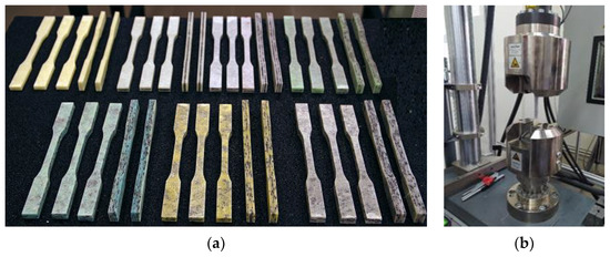 The research materials were made using manual lamination with the use of constant double-sided pressure for all variants. The value of the pressure (675 N per mold) has been determined in such a way as to prevent excessive filtration and leakage of the resin. A 300 × 900 mm cuboidal steel mold, brushes and rollers were used for manual lamination. A static tensile test was performed for samples prepared via waterjet cutting in seven material variants and 10 pieces for each variant in accordance with the PN-EN ISO 527-4: 2022-06 standard [26]. Figure 1 shows the geometry of the samples. The cut samples were subjected to a static tensile test on a hydraulic testing machine of the Zwick and Roell type MPMD P10B with testXpert II v 3.61. Figure 2a shows samples made from all variants of the materials produced and tested. Figure 2b shows a sample of K3 composite during site testing.