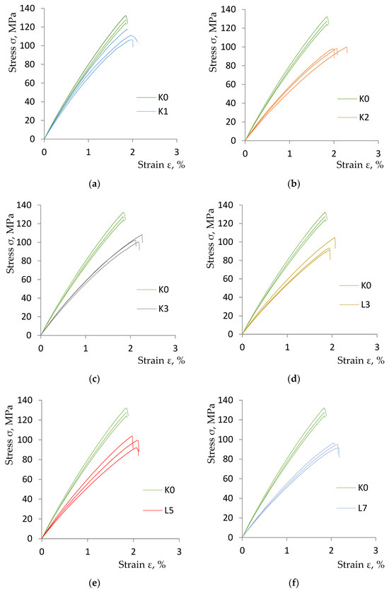 Diagrams of the static tensile test of the tested variants of composite materials obtained from the Zwick Roell testing machine: (a) K0 and K1 specimens; (b) K0 and K2 samples; (c) K0 and K3 samples; (d) K0 and L3 samples; (e) K0 and L5 samples; (f) Samples K0 and L7.