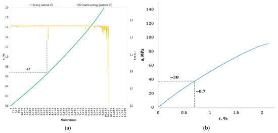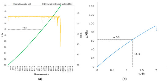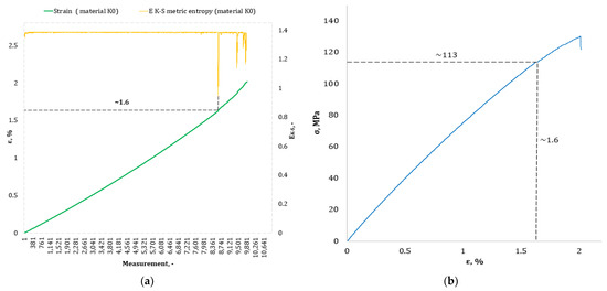 Figure 4, Figure 5, Figure 6, Figure 7, Figure 8, Figure 9 and Figure 10 show selected tensile curves that represent each type of material used in the test. These drawings consist of part (a), which shows the course of the ε strain curve, and part (b) showing the results of calculations of metric entropy EK-S as a function of the study time ε = f(t). The time represented is the number of the next (discrete) measurement point. The test was performed with the testing machine sampling set to 50 Hz, so 1 s of the test corresponds to 50 consecutive measurement points. Calculations of metric entropy EK-S were performed on a set of ε values for each tested sample maintaining the same lengths of the assumed intervals, i.e., 40 measurement points, and the same number of adopted sub-intervals, i.e., four. The calculations were performed using the proprietary Entropy K-S program version 1.20. The methodology of metric entropy calculations used in this study is described in detail in the source items [19,20,22] where phase portraits of metric entropy are additionally presented.