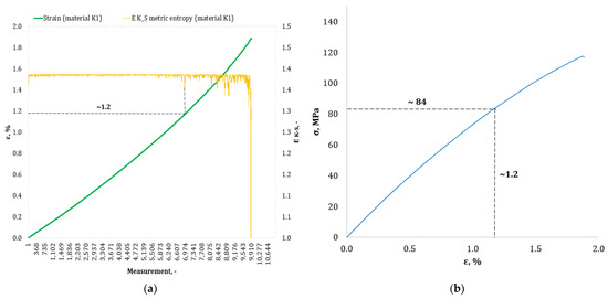 (a) The course of the strain curve for the K1 composite specimen; (b) the results of the calculation of metric entropy EK-S as a function of test time for the K1 composite sample.