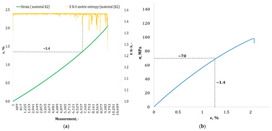 (a) The course of the strain curve for the K2 composite specimen; (b) the results of the calculation of the metric entropy EK-S as a function of the test time for the K2 composite sample.