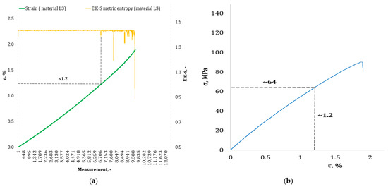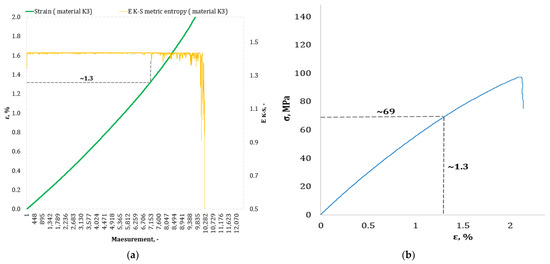 (a) The course of the strain curve for the K3 composite specimen; (b) the results of the calculation of the metric entropy EK-S as a function of the test time for the K3 composite sample.