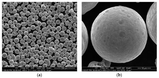 Figure 1. SEM images of IN 625 powder: (a) image at 400×; (b) image at 5000×.