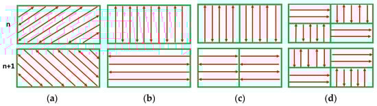 Figure 3. Bi-directional scanning strategies used for manufacturing the IN 625 bridge samples. (a) 67°, (b) 90°, (c) 90° strip, (d) 90° chessboard.